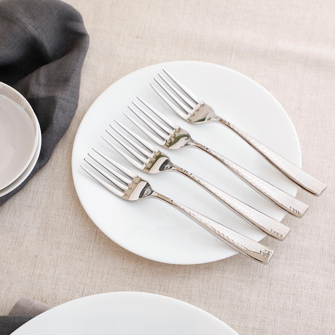 The dinner forks have a classic and timeless design, with four long and slender tines that are perfect for holding a variety of different types of food. The polished silver finish adds an extra touch of sophistication and elegance to these already stylish forks.