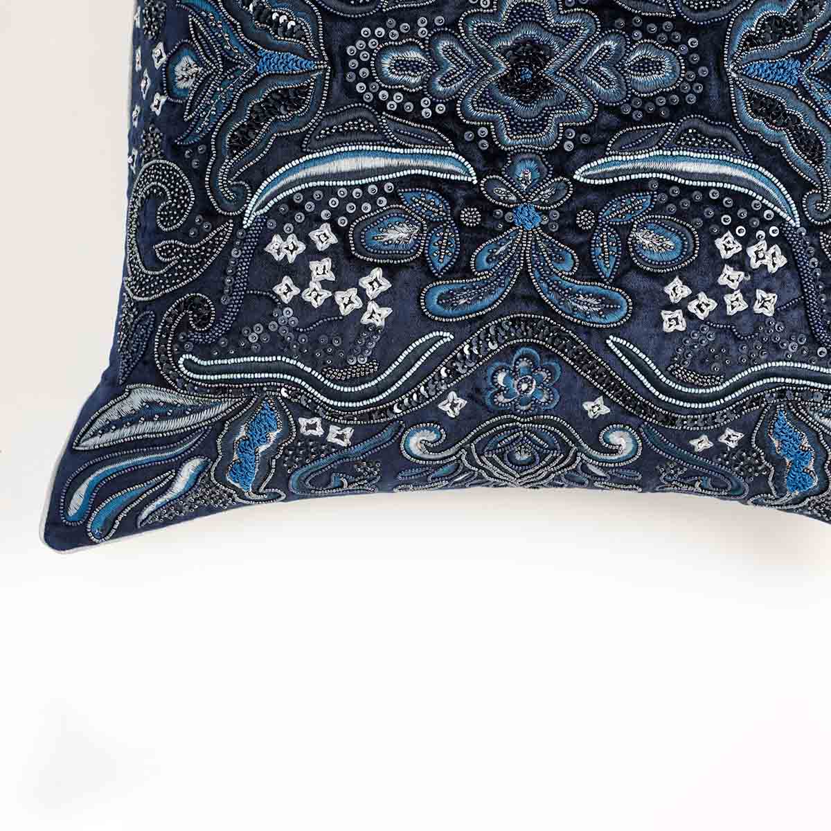 The richly Embellished with the hand sequencing and embroidery work, the Benel Cushion is covers is available in 20" x 20" size, to fit well on your couches or elevate any interior space. The Subtle grace of the surface is accentuated with its Sheening rich blue color on cotton velvet fabric.
