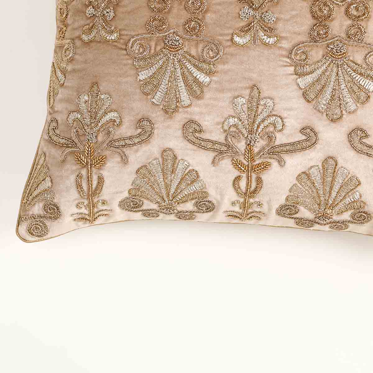 The richly Embellished with the hand sequencing and embroidery work, the Breara Cushion is covers is available in 20" x 20" size, to fit well on your couches or elevate any interior space. The Subtle grace of the surface is accentuated with its Sheening Beige color on cotton velvet fabric.