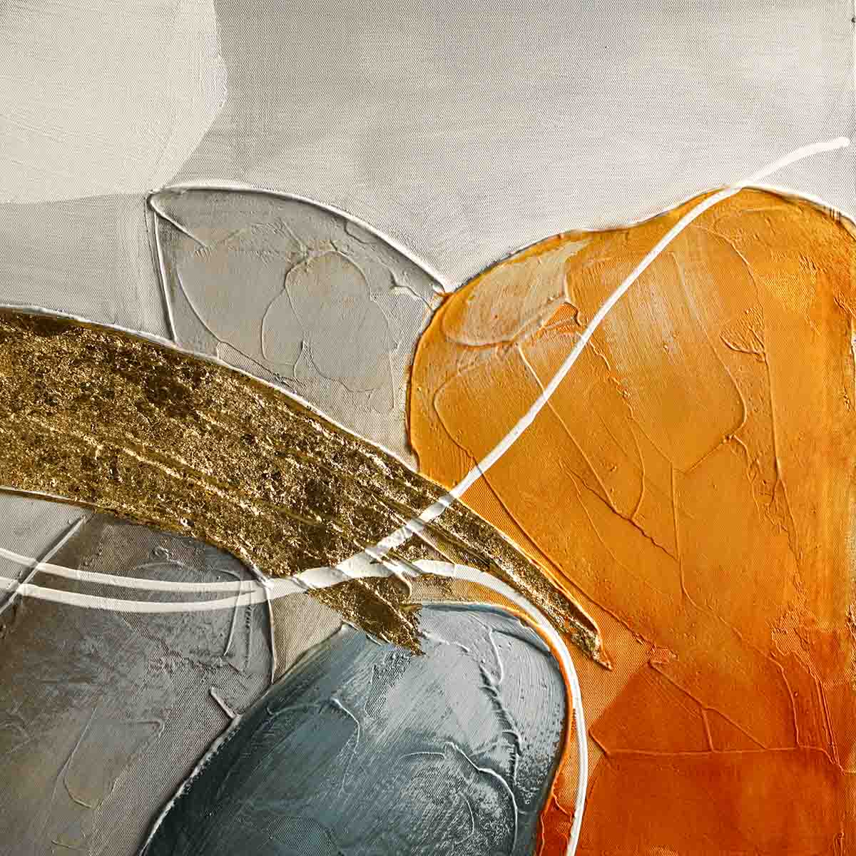 A well Composed series of wall art, are artistically canvased with hues & Shades of neutrals and contrasting warm orange strokes. To add an elevating character to the wall art, the touch of metallic subtle gold embraces the beauty of wall art. Place a single or arrange in a set of 4 series the wall art is suited for enhancing any landscapic wall.