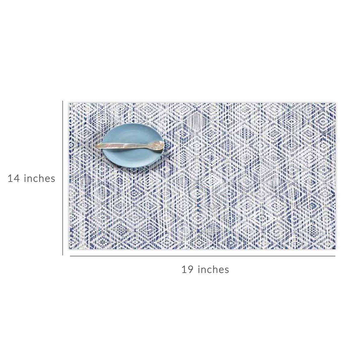 Traditional diamond twill is reimagined as a blue-toned mosaic in this beautiful mat that dresses up indoor or outdoor spaces. Signature bi-color yarns weave a complex lattice composed of uniquely woven diamonds. Each mat is woven of PVC yarns treated with TerraStrand, Chilewich's proprietary compound that's phthalate-free and contains renewable vegetable compounds that replace petroleum-based plasticizers used to soften yarns.