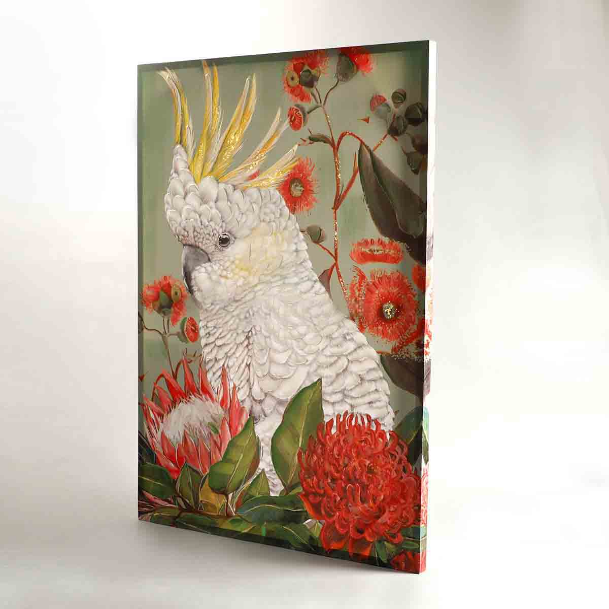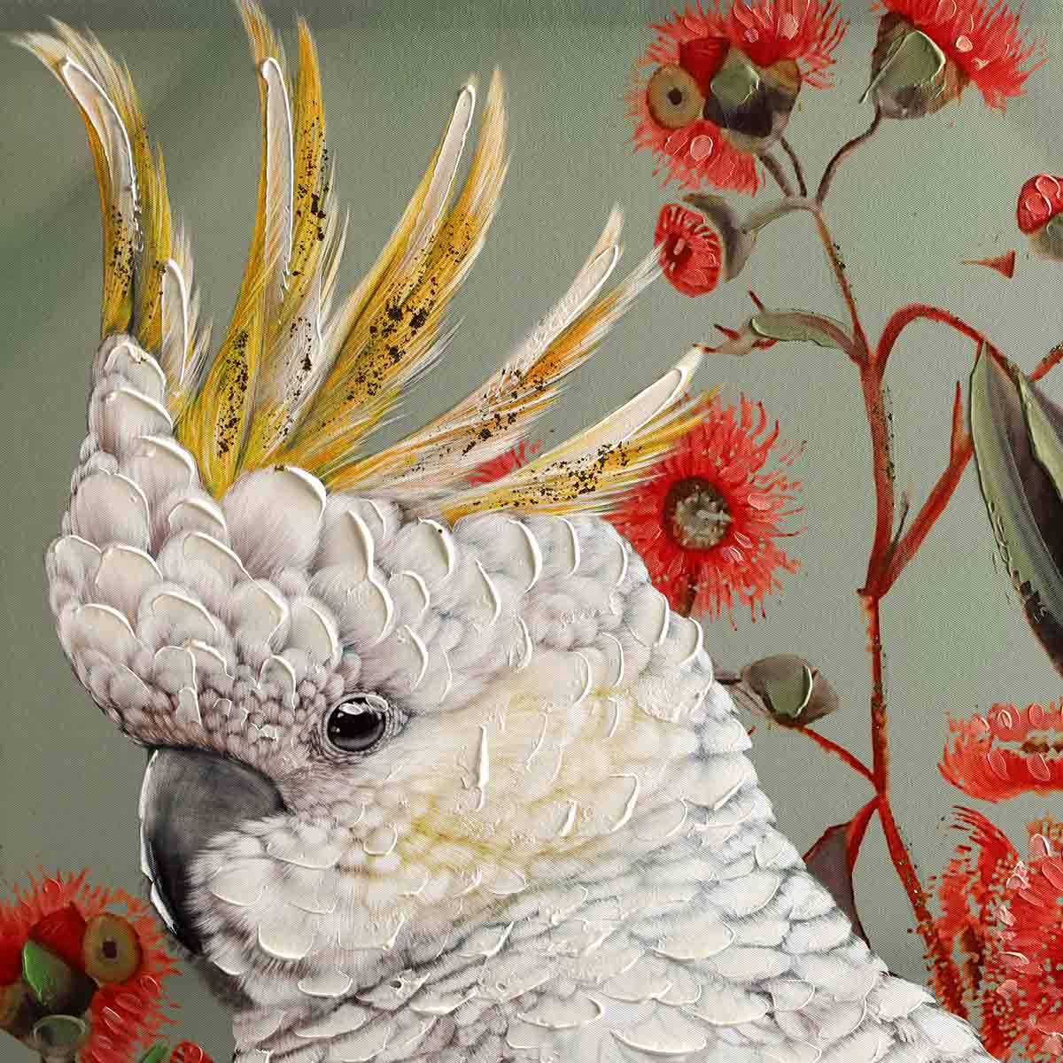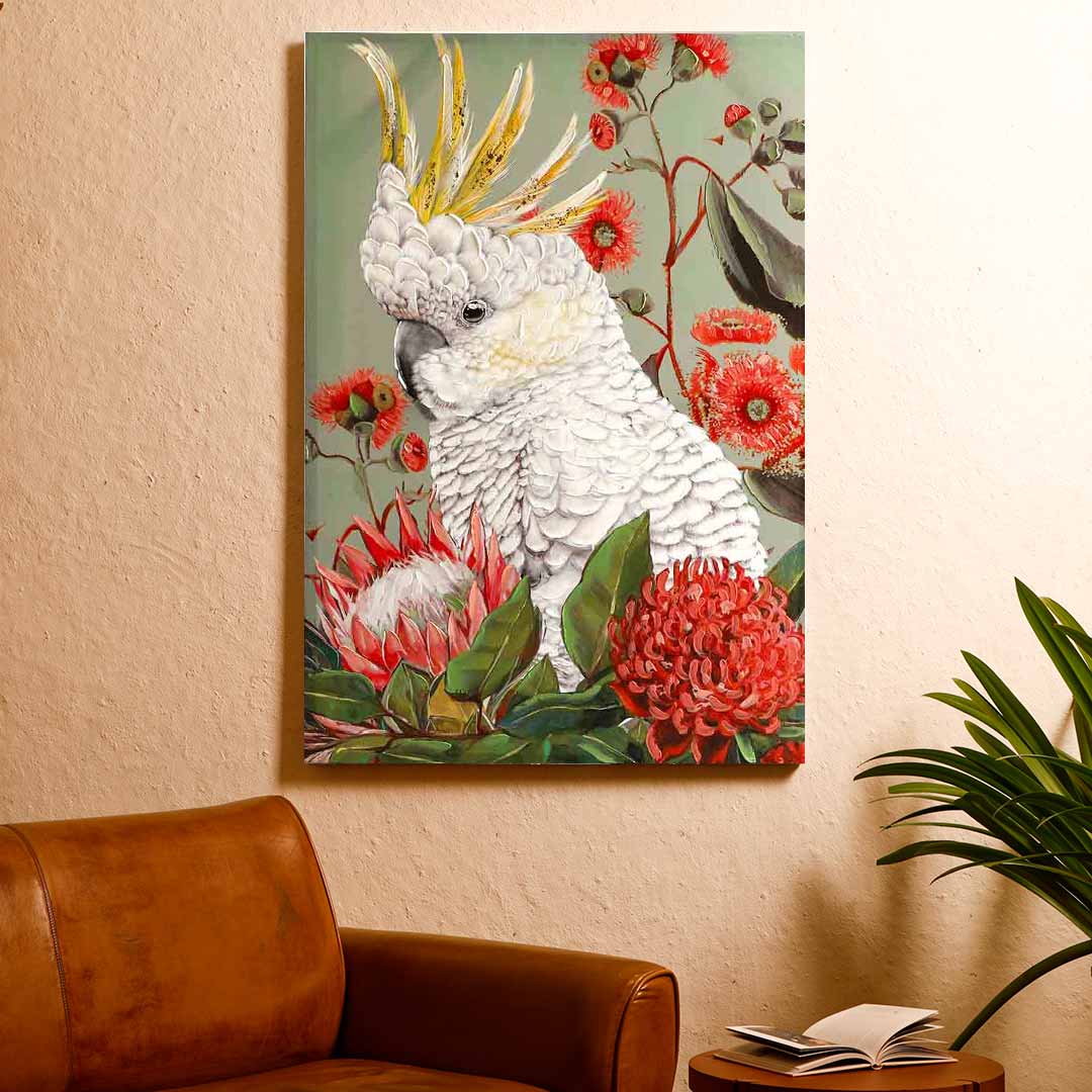 The white cockatoo depiction on Canvas, is a native to Australia. Its dramatic character and beautiful yellow feathers, with contrasting background brings out the Flora & Fauna of natural habitat. The Beautifully Hand painted Cockatoo Bird Wall art is impeccably characterized on 28 x 39 Inch frame.