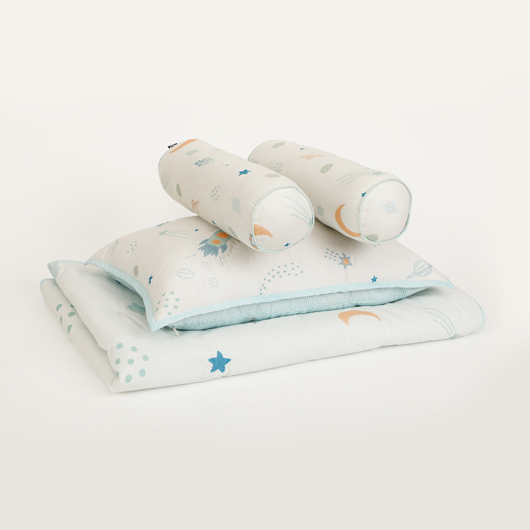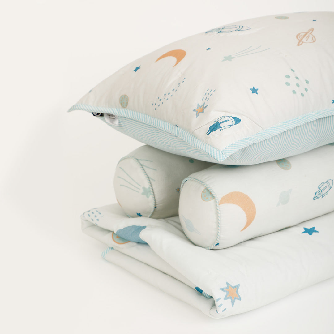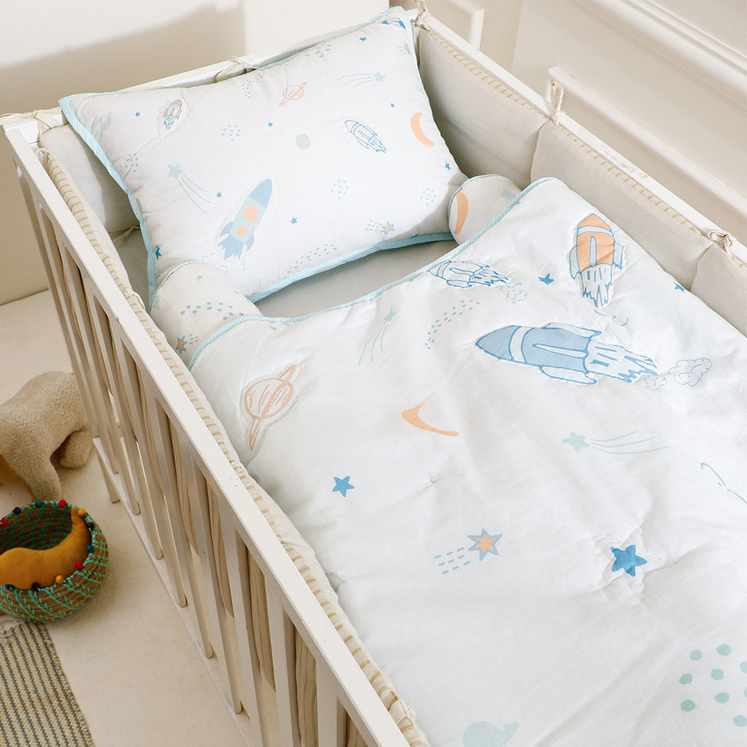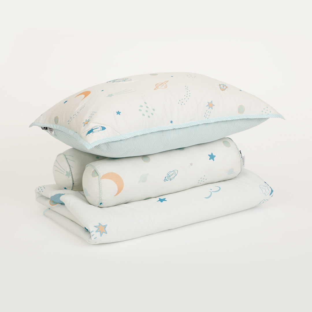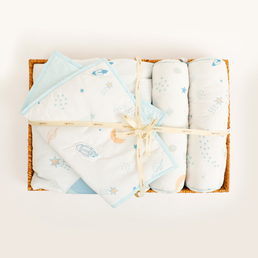Wrap your little star in celestial comfort with the Galaxy Cot Set, thoughtfully designed to bring warmth and wonder to your baby’s space. Featuring a dreamy quilt, two soft bolsters, and a plush pillow, this 4-piece set creates a cozy and secure cocoon for restful naps and peaceful nights. Adorned with a subtle yet charming galaxy-inspired design, it’s crafted in soft, breathable fabrics that are gentle on delicate skin and easy to care for. Perfect for creating a serene, starry theme in your nursery.