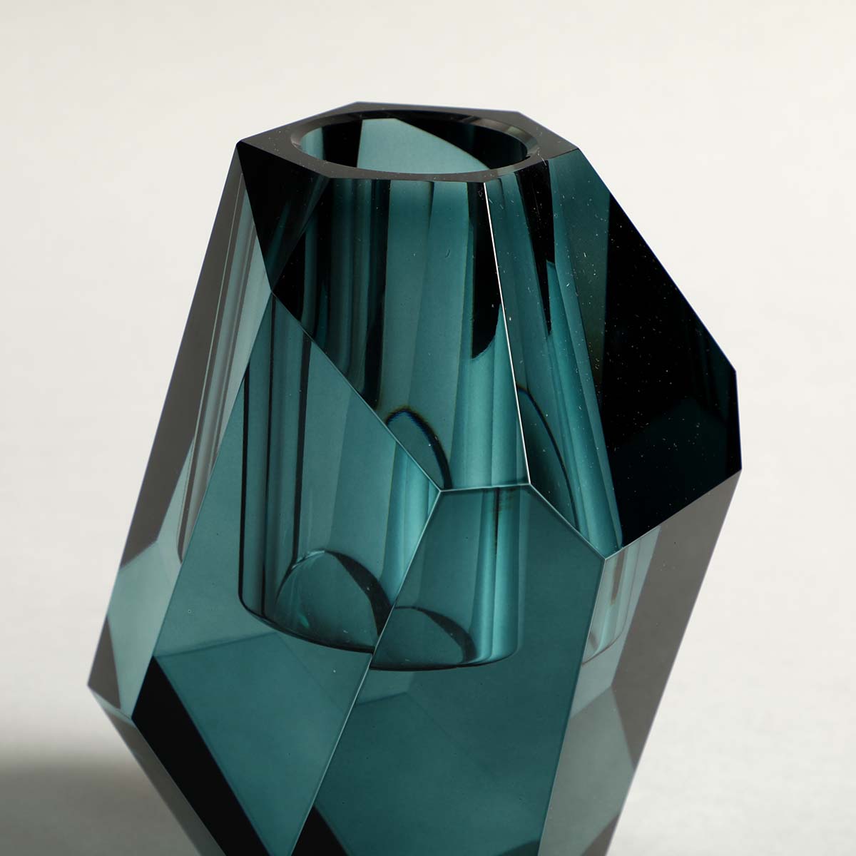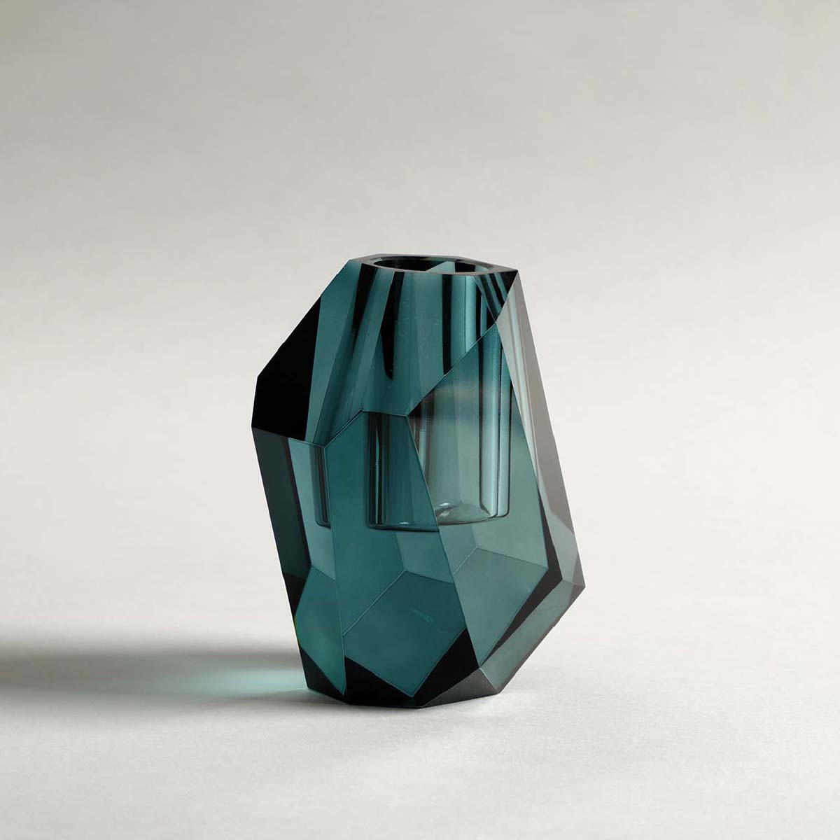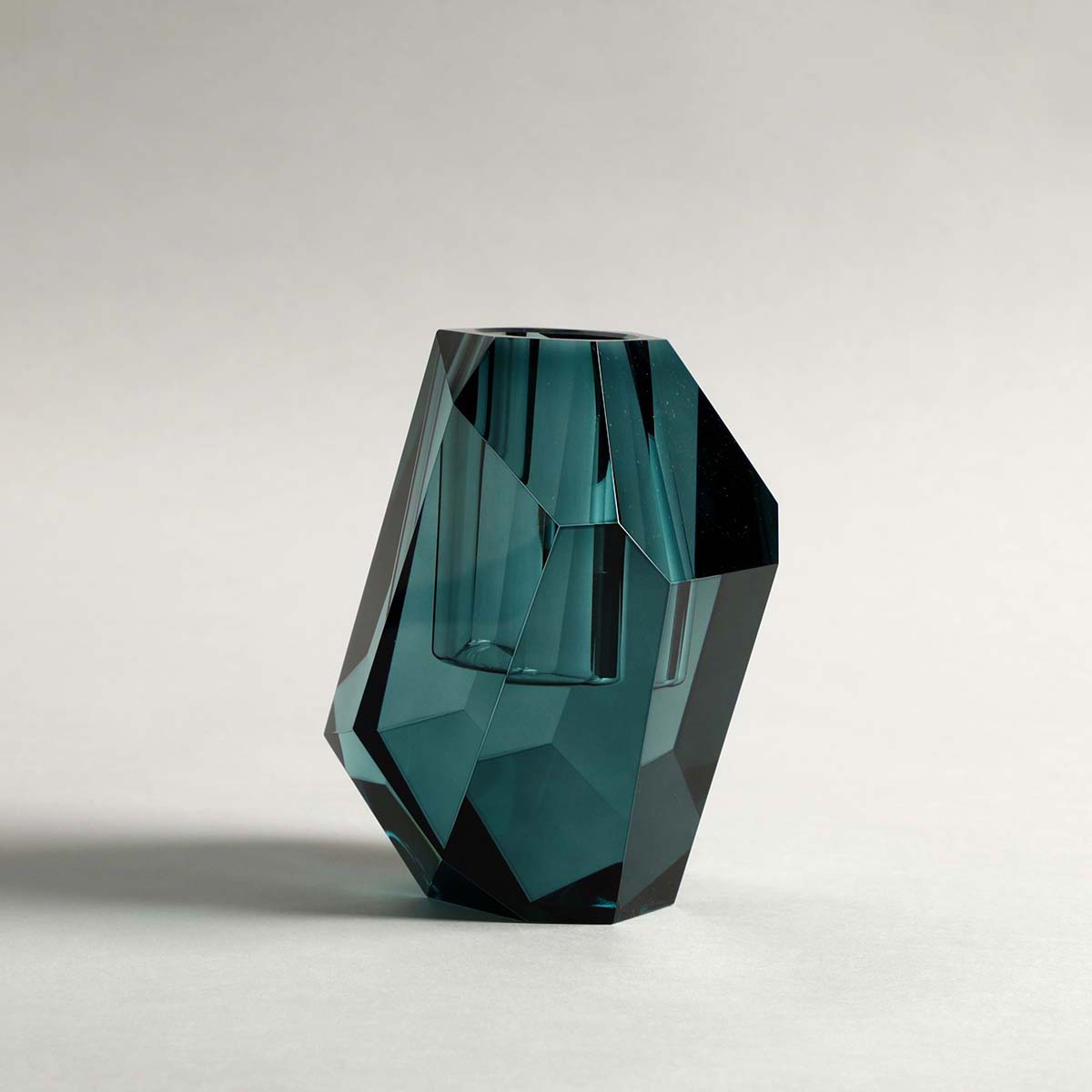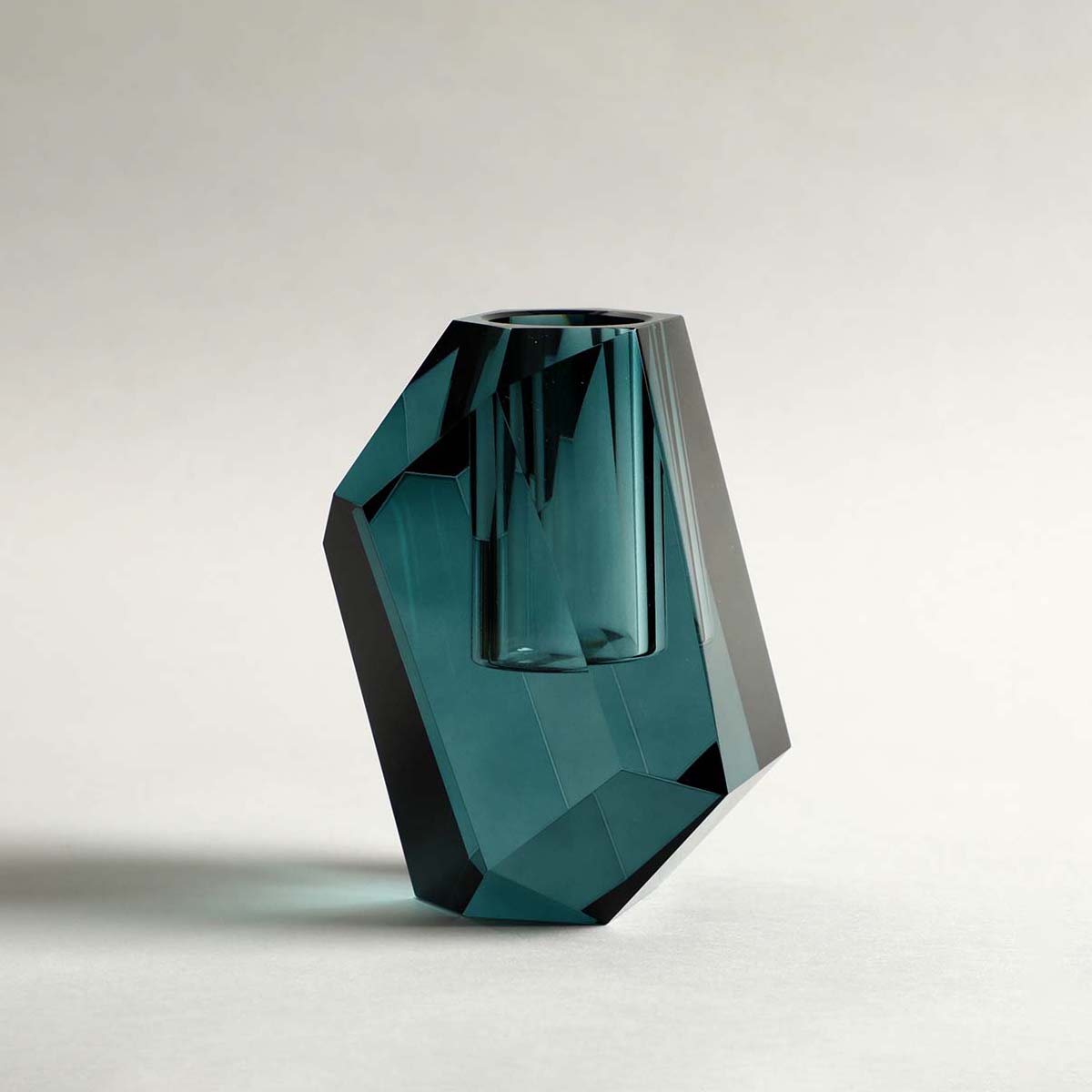 The geometrically champhered surface makes the language of Glen Crystal Vase, a statement piece to have, paralleled with utility of vase shaped with coloured crystal elevates the Interior space. The Crystal Vase is available in Amber & blue tinted colours.