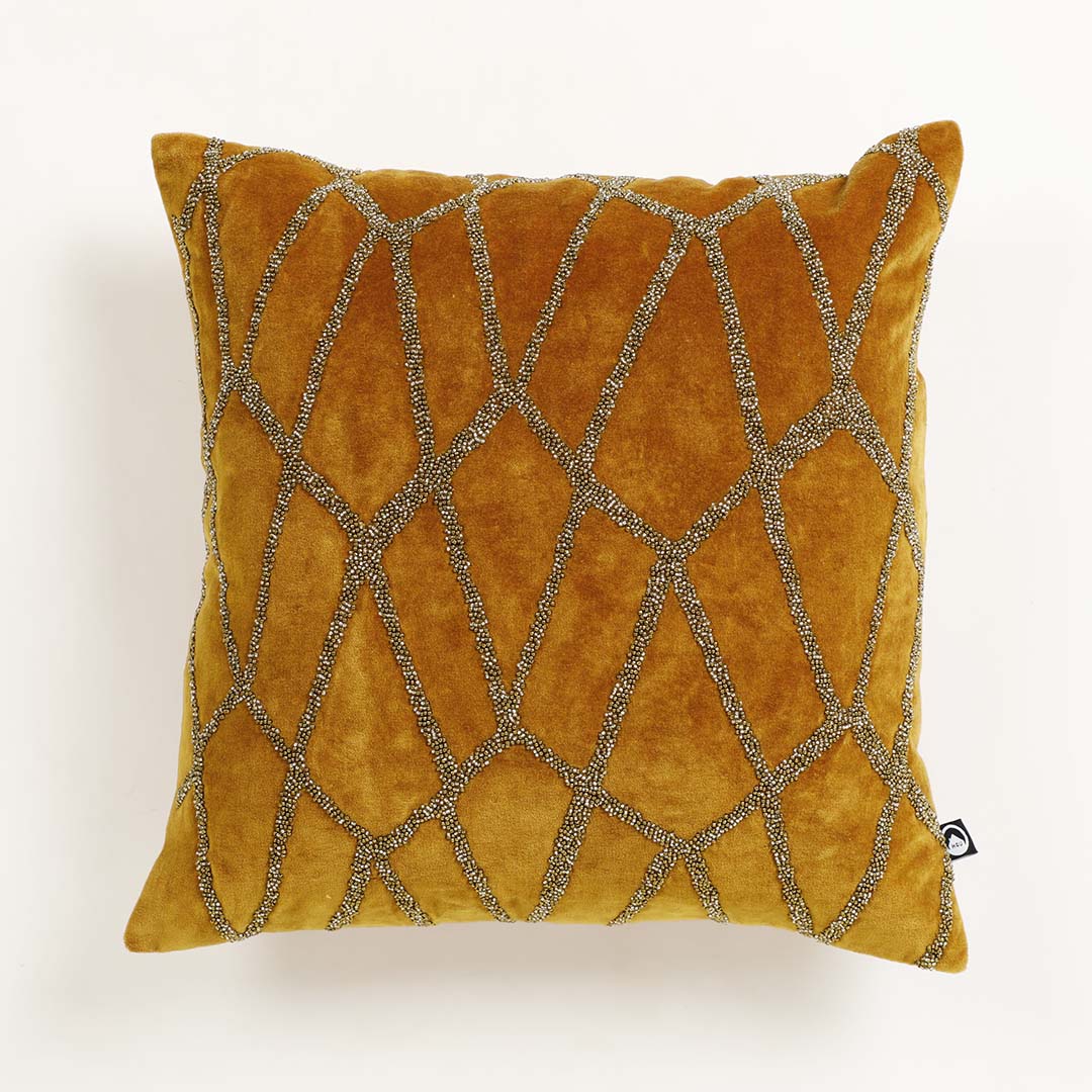 The Honey Cushion Cover is a true celebration of refined craftsmanship. Delicately hand embroidered with intricate bead work , it creates a raised, sculptural texture that reflects understated luxury. Crafted from a rich velvet fabric, this cushion cover combines softness & understated glamour with durability, ensuring timeless elegance. The concealed zipper closure completes the design with seamless finesse. Perfect for luxury interiors, the Honey Cushion Cover adds a layer of bling ,sophistication and artistry to your living space.
