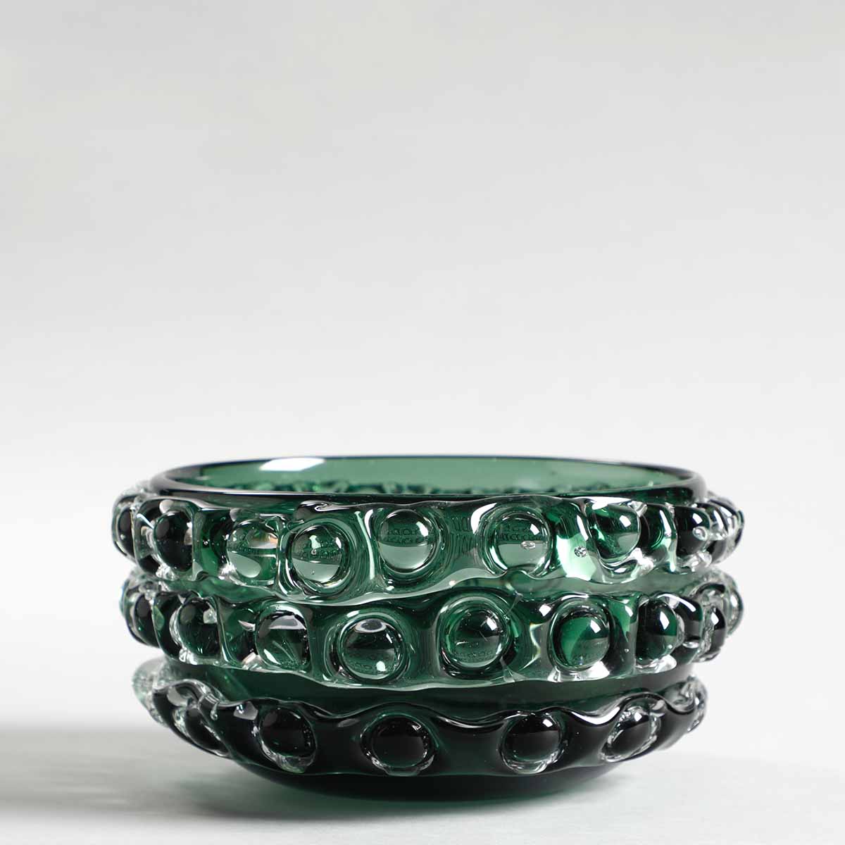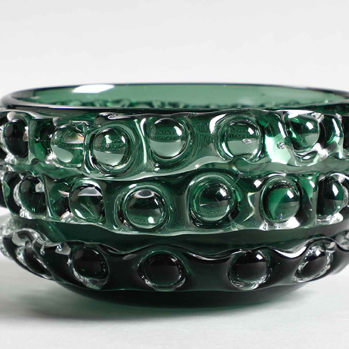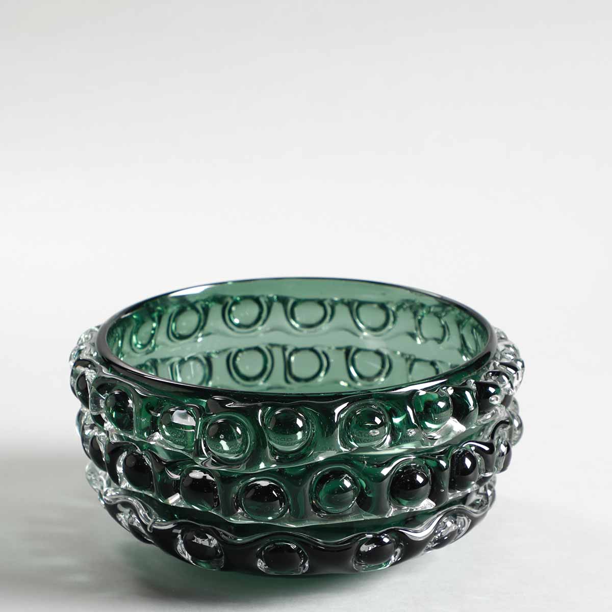 An embossed texture playfully recreating a swirl lends this centerpiece its outstanding dynamism. Fashioned of prized crystal in a warm Green color, it allows for gathering small fruits or candies on top of coffee tables. The exquisitely manual nature of the decoration process implies the uniqueness of every single piece. Any microscopic bubble that you notice is part and inherent beauty of the manufacturing process.