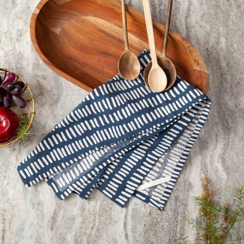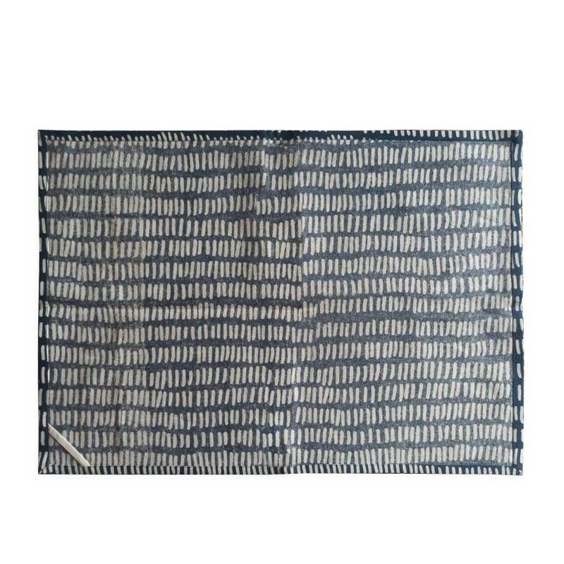 Inspired by indigo print and a improvised white capsule motif and arranged in regular linear pattern, the Linije Kitchen towel bring crafted grace. Made out of 100% cotton fabric makes it functionally apt for Kitchen purpose. The Size of the towel gives the edge of functionality and with a corner strap hangs the towel to dry off and avoids overlay of fabric.