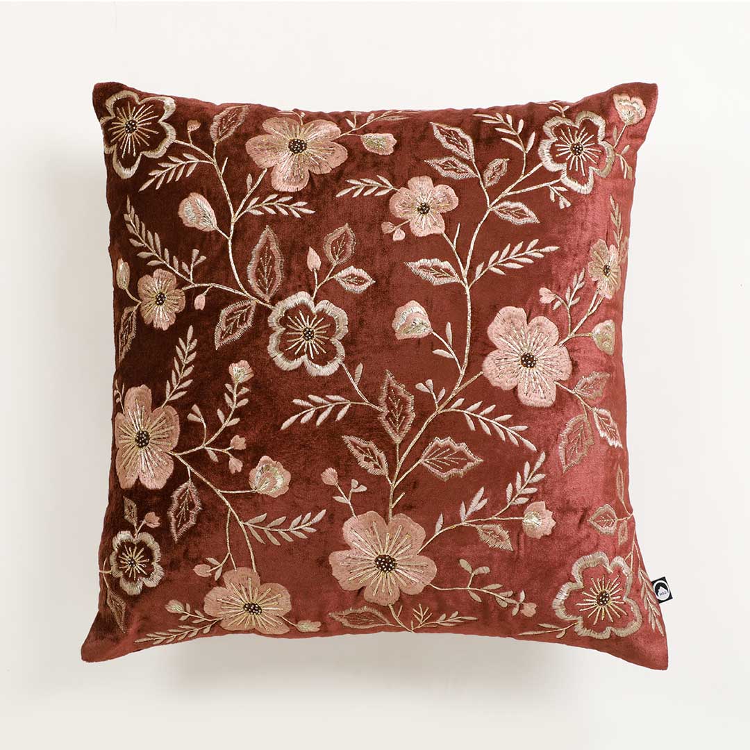 The Mahogany Cushion Cover is a true celebration of refined craftsmanship. Delicately finished with intricate floral embroidery and beaded adda work which creates a raised, sculptural texture that reflects understated luxury. Crafted from a rich velvet fabric, this cushion cover combines softness with durability, ensuring timeless elegance. The concealed zipper closure completes the design with seamless finesse. Perfect for luxury interiors, the Mahogany Cushion Cover adds a layer of bling ,sophistication and artistry to your living space.