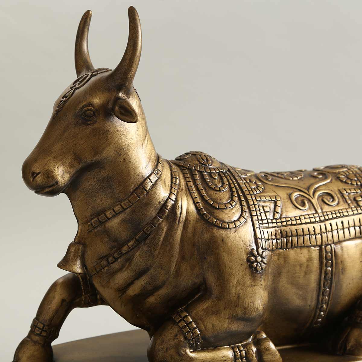 Our Nandi sculpture in sitting posture will be a marvelous addition to your home in the brass antique look. Nandi represents the creative energies of the restless mind brought under control by focusing on Shiva who is Pure Consciousness. Kneeling in reverence and worship waiting to serve his Lord Shiva the nandi is a symbol of purity and strength. This handmade nandi sculpture radiates its own inner strength, possitivity and a divine energy in its surrounding.