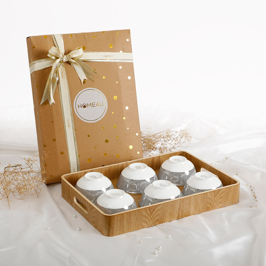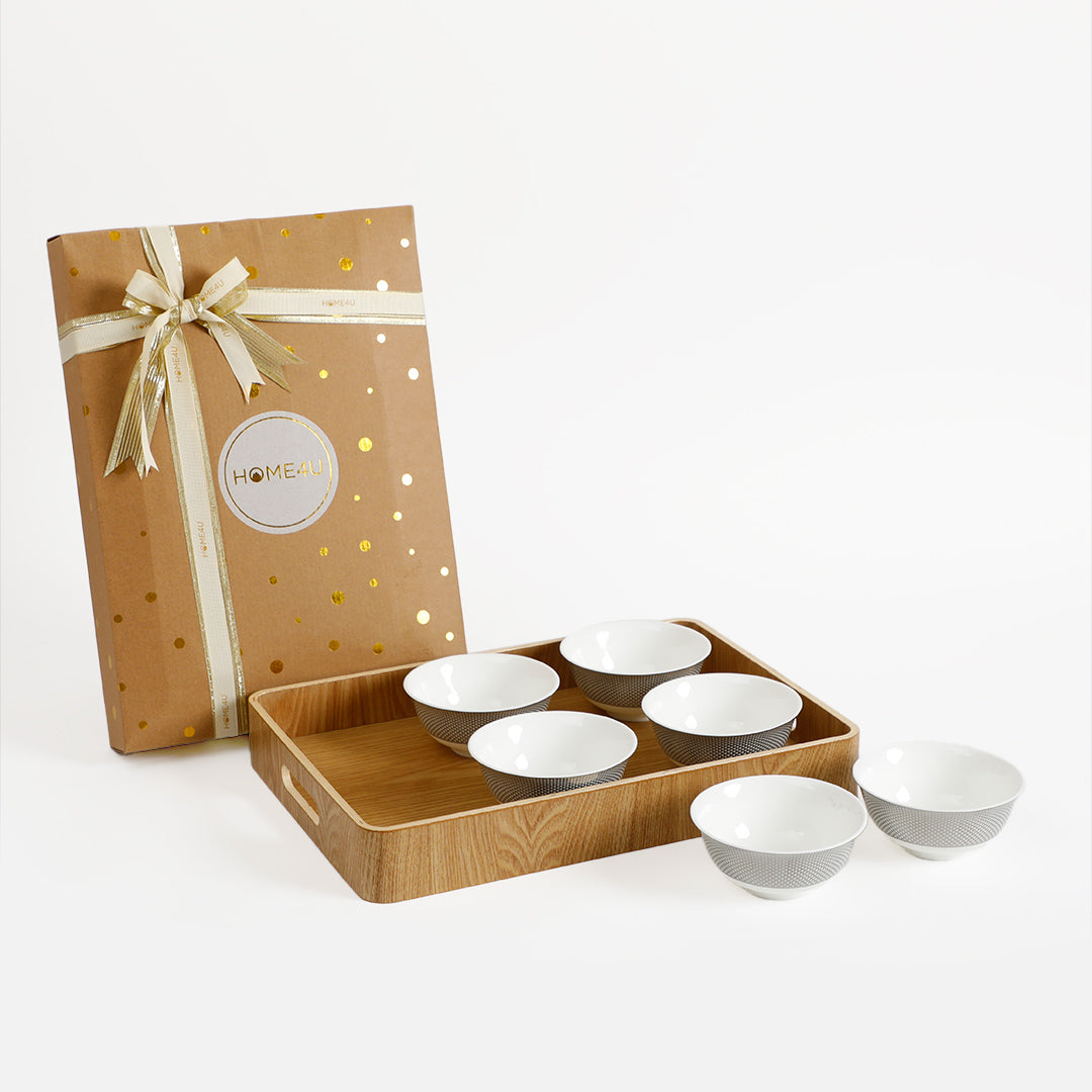Celebrate thoughtful gatherings with the Plarixie Gift Set — a beautifully coordinated serveware ensemble featuring one elegant wooden tray and six matching bone china bowls. Designed to bring a touch of refinement to your table, this set blends function with artistry, making it perfect for serving dry fruits, snacks, or desserts. This gift set draws inspiration from contemporary geometry and timeless charm — a modern statement in serveware that adds grace to every occasion.