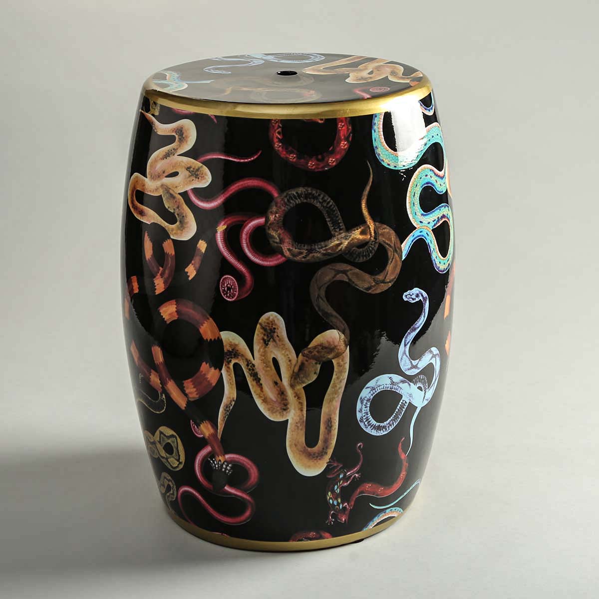 Featuring an array of vibrantly coloured snake motifs juxtaposed against a dark background, the Retro Snakes Porcelain Stool is an eclectic, ornamentally striking accent furniture piece with a moody, evocative colour palette ideal for all interior spaces.