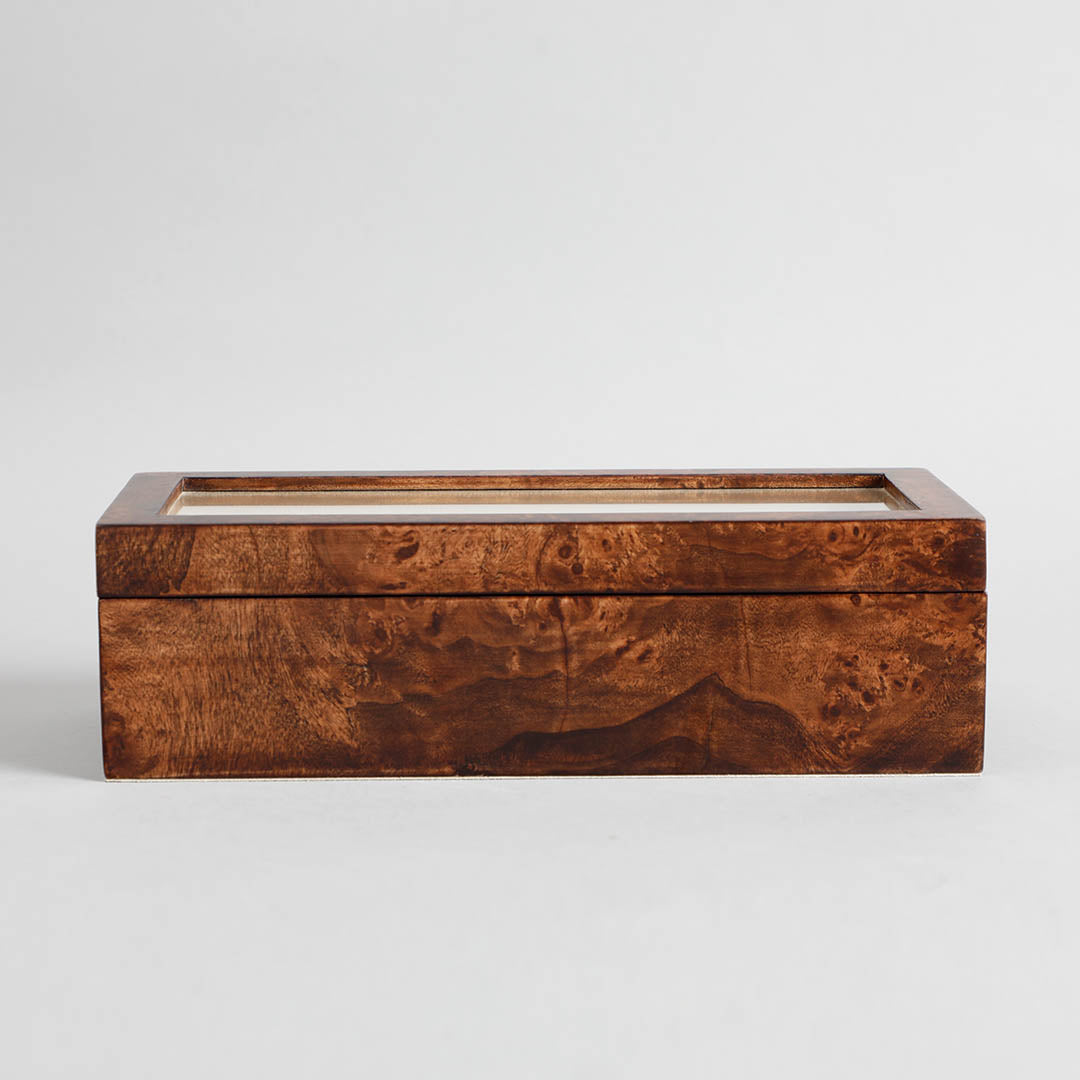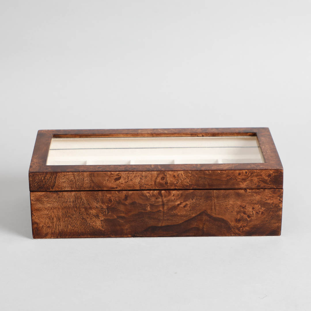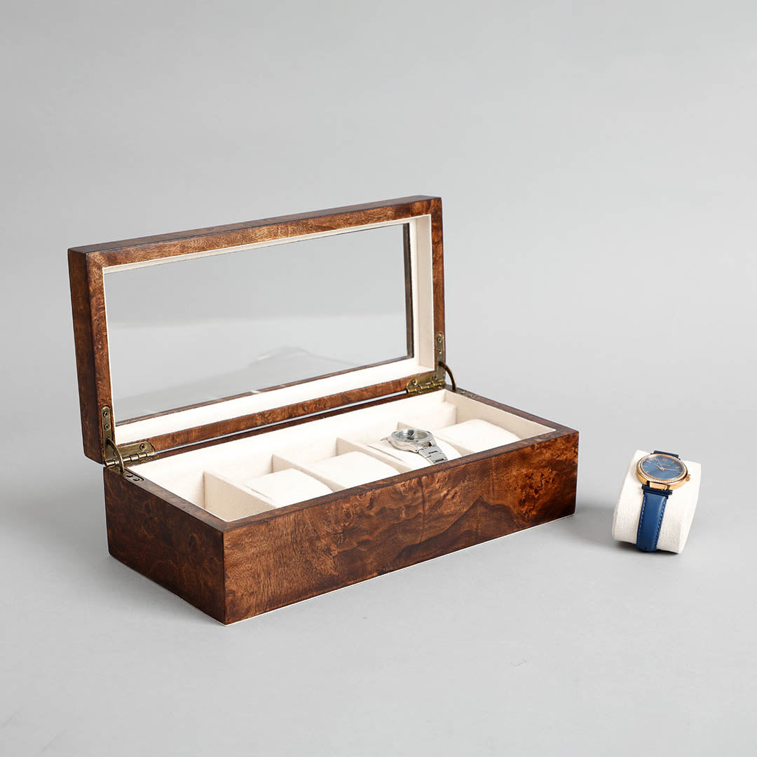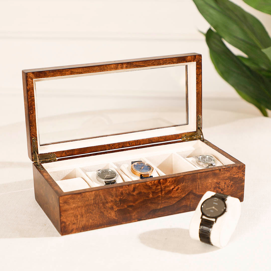 Organize your watch collection with the Sahaj Brown 5-Slot Watch Box, crafted from durable veneer and MDF. This sophisticated box features five compartments, providing ample space to safely store your watches. The warm brown finish and sleek design make it a stylish addition to your dressing table or closet.