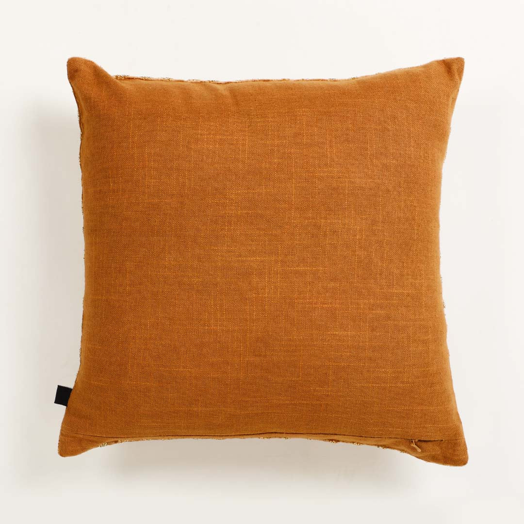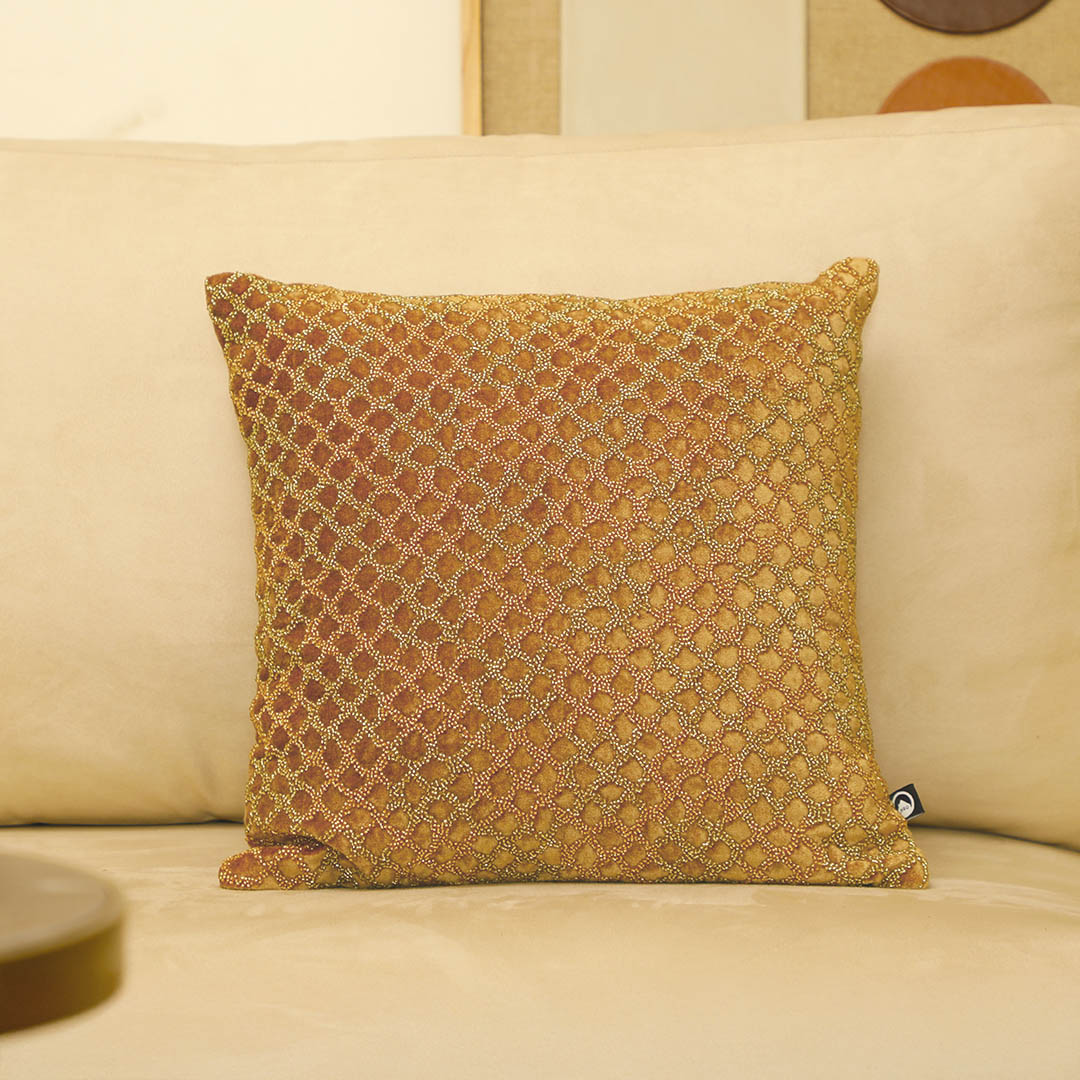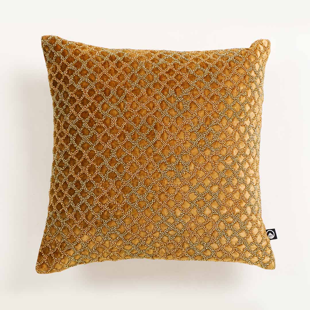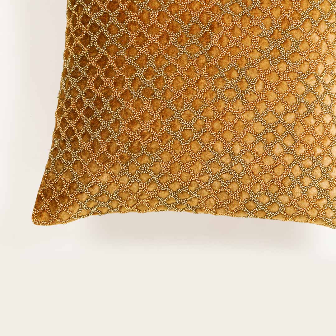The Sunlit Cushion Cover is a true celebration of refined craftsmanship. Delicately hand-finished with intricate beaded adda work which creates a raised, sculptural texture that reflects understated luxury. Crafted from a rich velvet fabric, this cushion cover combines softness with durability, ensuring timeless elegance. The concealed zipper closure completes the design with seamless finesse. Perfect for luxury interiors, the Honey Cushion Cover adds a layer of bling ,sophistication and artistry to your living space.