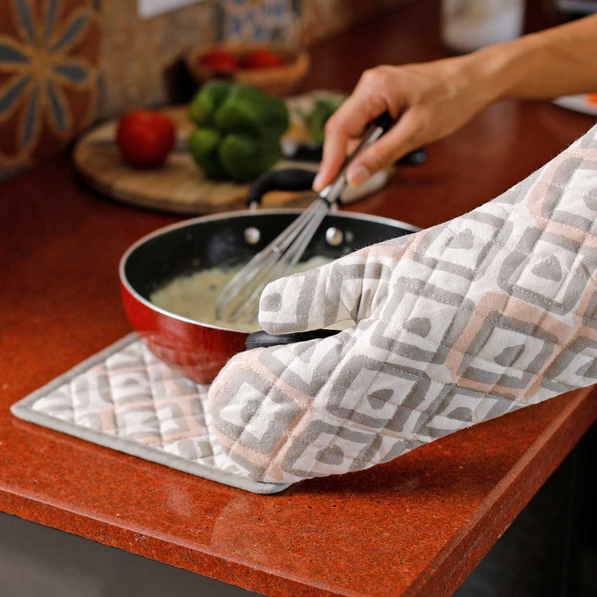 With the play of pastel colours the Taimi pot holders are made up of 100% cotton with a thick filler to withstand high temperatures and provide an appropriate base to the vessels and to suit the daily Chores of Kitchen, the pot holders are easily washable kitchen essential.