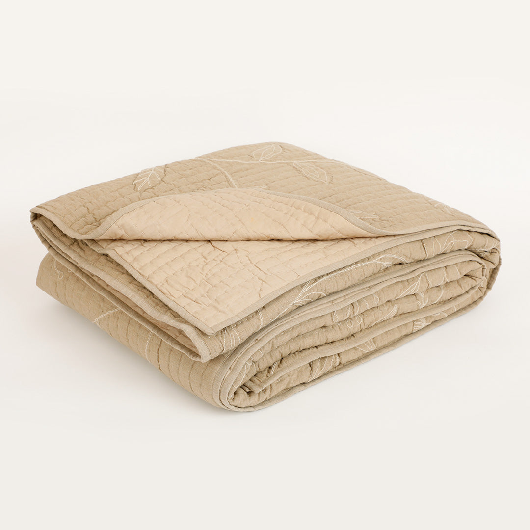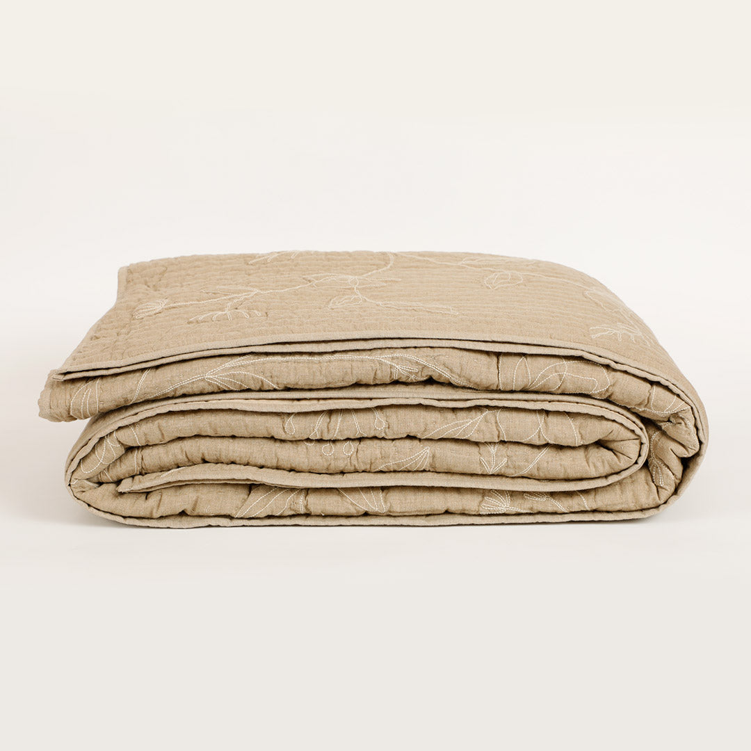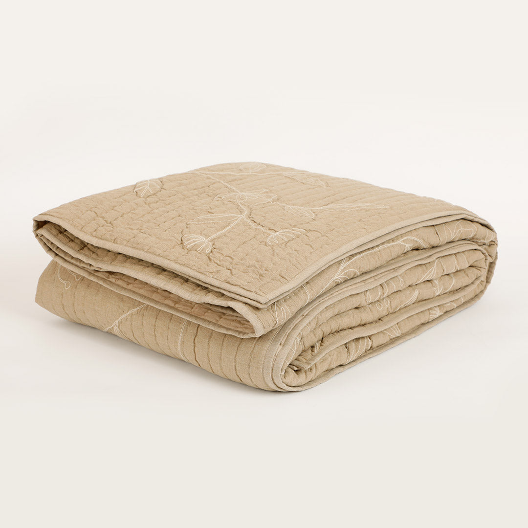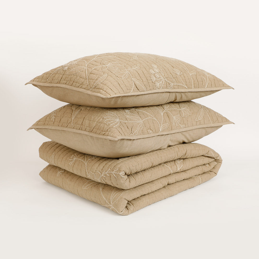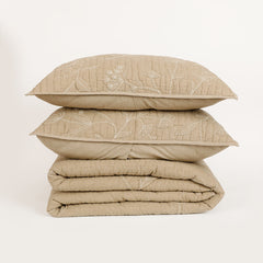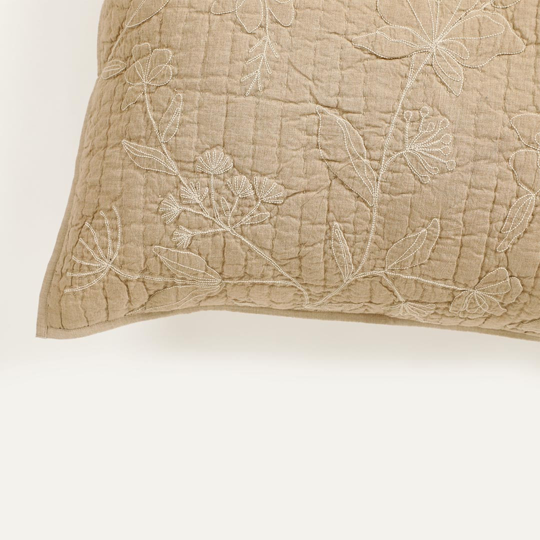 Elevate your home decor with the perfect blend of softness and structure in this dual-fabric cushion. The Whimsy Embroidered Bedspread with Sham Set is crafted from smooth cotton chambray and voile fabric, this beige piece combines refined style with lasting comfort. The floral embroidery quilted detail is delicate yet modern which adds a layer of artistry and vintage charm to this gorgeous set.