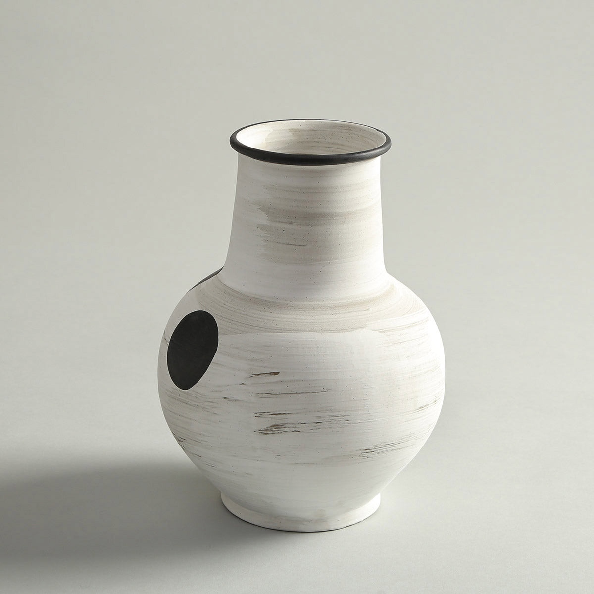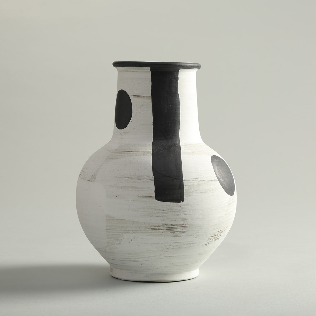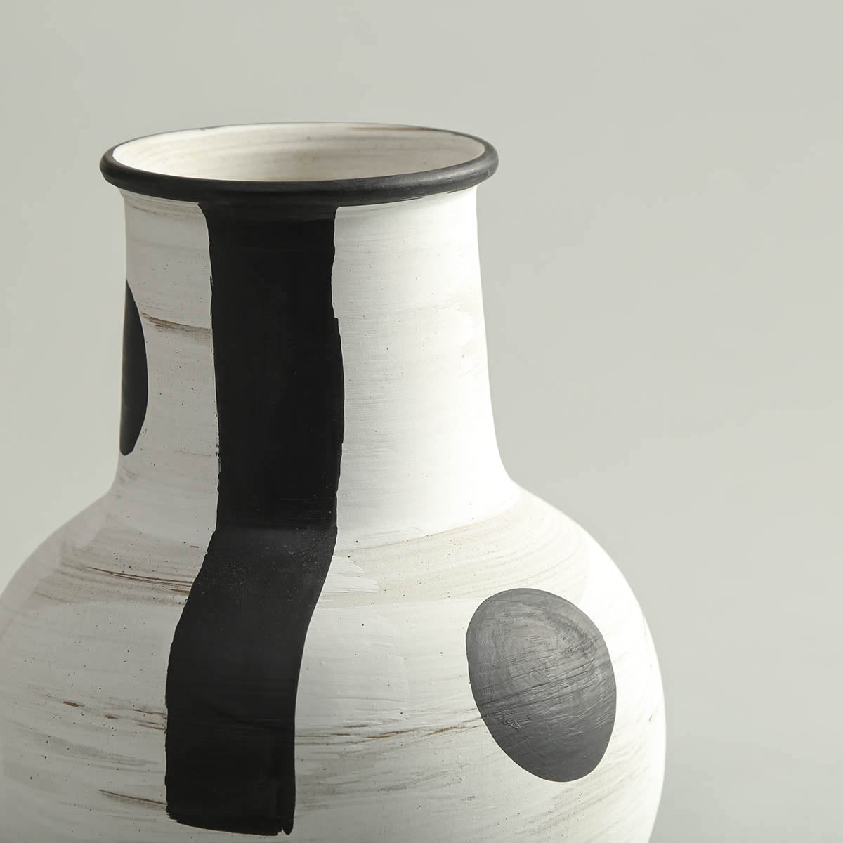 Make a statement with this unconventional vase adorned with primary shapes and lines drawn in eye-catching streaks of black. The textured porcelain and unique, haphazard shape make for a charming decor piece that demands attention. Place it on a shelf, side table, or console table- the possibilities are innumerable. Crafted in versatile hues of black and white, use it to add character to any interior space or present it to someone as a memorable gift.